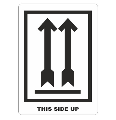 Etiket voor op pakketten wit/zwart 70x110 mm bedrukking: Pijlen en tekst THIS SIDE UP, 500 per rol.