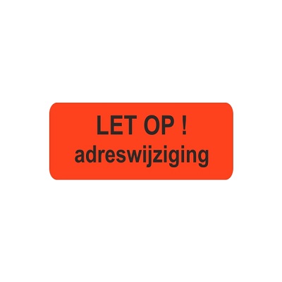 Etiket fluor rood 38x15mm bedrukking: LET OP ! adreswijziging, aantal 500 per rol.