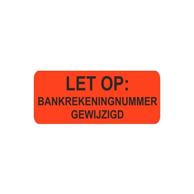 Etiket fluor rood 38x15mm bedrukking: LET OP: Bankrekeningnummer gewijzigd, aantal 500 per rol.
