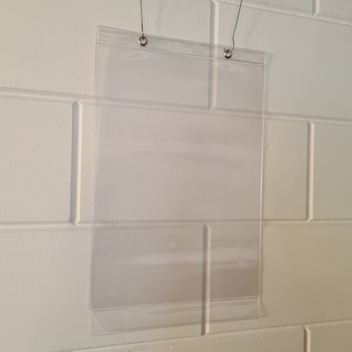 Prijskaarthoes vertikaal voor 297x420 mm met 2 ophangoogjes, deze uitvoering is voorzien van 2 metalen ringetjes. (Din A3) ,die vallen boven/buiten het A3 formaat. Materiaal is van flexibel kunststof.