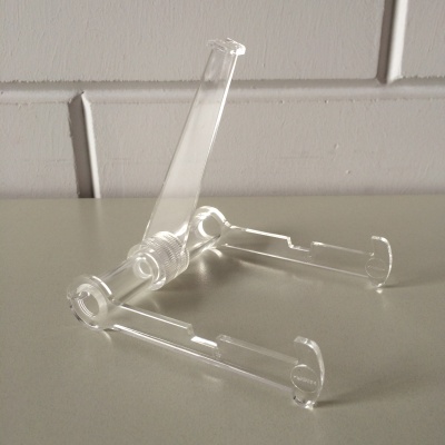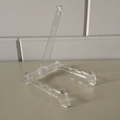 Standaardje transparant afmeting bodemmaat breed 35x45 mm lang met sleufdikte 2mm voor prijskaartjes van karton. Per zakje van 20 stuks. Universeelstandaardje, kaarthoudertje.