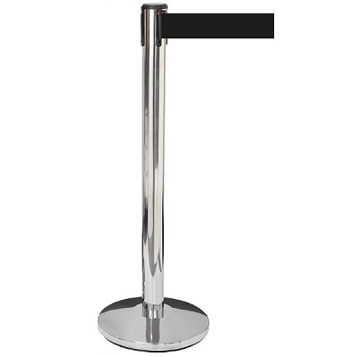 Toegangspaal kleur chroom hoogte 1 meter met zwarte riem, lengte 250 cm, en 1 wandbevestiging. De riem kan ipv aan de wandbevestiging ook aan de volgende toegangspaal bevestigd worden. Het gaat per artikel om 1 paal met riem.