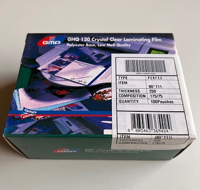 Lamineerhoes / lamineersheets glanzend 80x111 mm geschikt voor afmeting Din A7, dikte 250 micron, verpakking met 100 stuks.