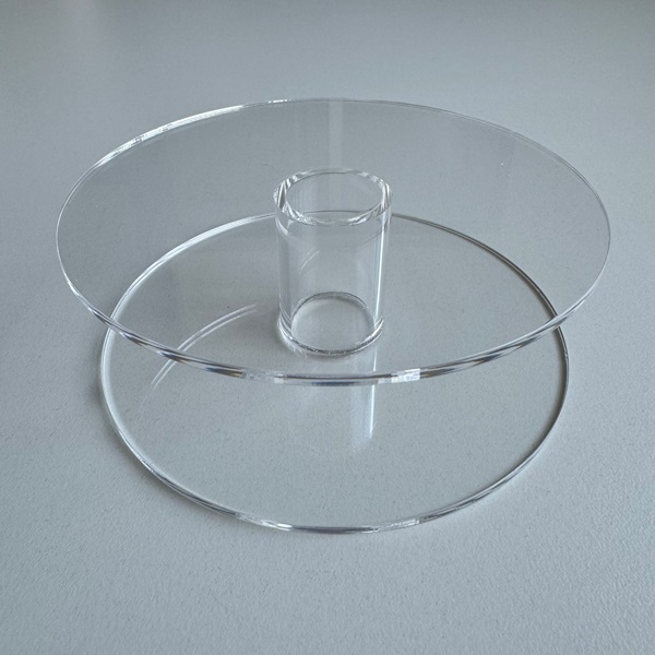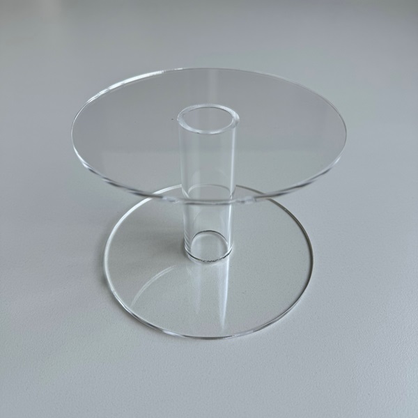 Acryl-schoenstandaard / zuiltje. Ronde uitvoering, diameter 13 cm hoogte 5 cm. De verbindingkoker heeft een diameter van 30 mm. Geproduceerd in Europa. Levering op bestelling - levertijd ongeveer 2 weken.