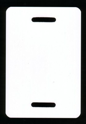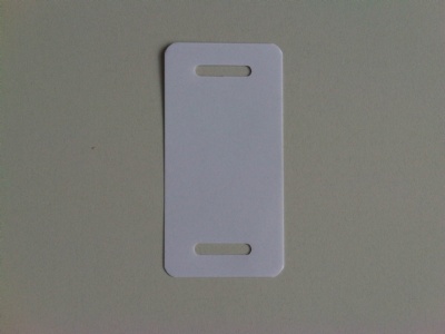 Kupa labels 54x110 mm wit dikte 0,20mm 2 band-sleuven 25mm, afgeronde hoeken. 1000 stuks in doos. (kupa = papierlaagje+kunststof+papierlaagje)