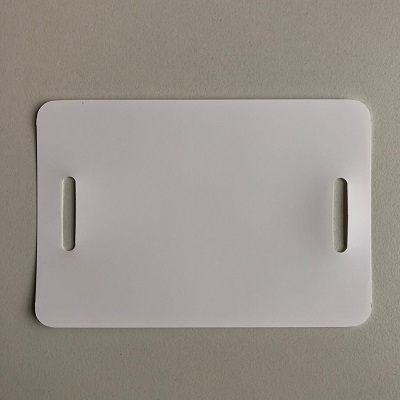 Kunststof PEM labels 150x270 mm wit dikte 0,20mm 2 band-sleuven 36mm, afgeronde hoeken. 1000 stuks in doos. Eventueel ook leverbaar in: blauw rood geel oranje grijs zwart en groen. PEM Eco 200 vervanger voor PVC.