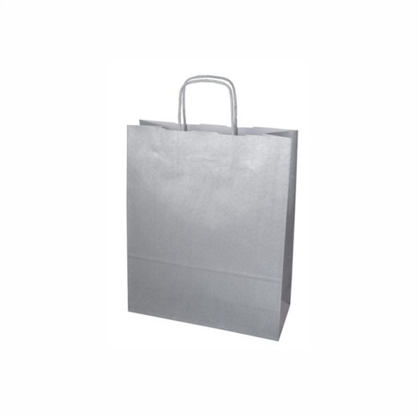 Papieren draagtas 18x8x21 cm - kleur zilver - met handvat in de vorm van gedraaid koord. Verpakking met 50 stuks. Deze draagtassen hoeft u NIET aan uw klant door te berekenen. Kunt u dus gratis meegeven.