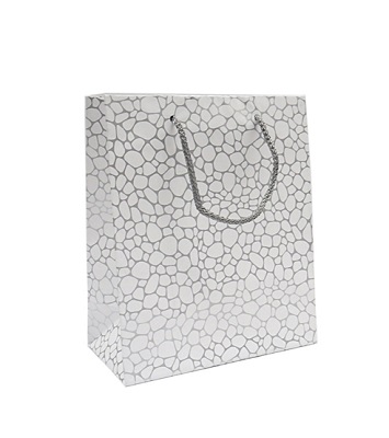 Papieren draagtas 19/10x23 cm - GRIND - kleur wit en zilver - met zwart koord als handvat. Verpakking met 12 stuks. Deze draagtassen moet u WEL aan uw klant door berekenen. Kunt u dus NIET gratis meegeven. Verbod op gratis verstrekking van deze gelamineerde papieren draagtassen. Zo lang de voorraad strekt.
