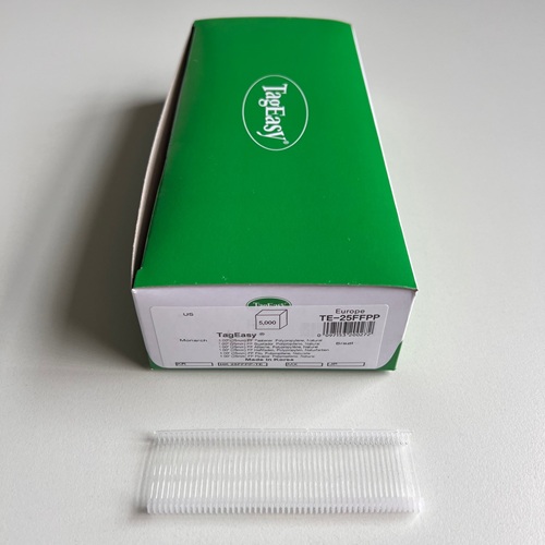 TagEasy textielpins 25 mm fijn PP. Doos met 5.000 stuks, materiaal PP. Aantal 50 textielpins per clip. Beperkt leverbaar.