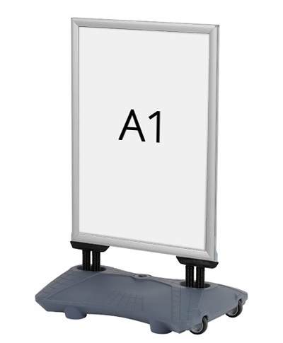 Stoepbord Boulevard Din A1 - afmeting. 59x84cm - Rollerbase. Kleur zwart. Profiel 32mm. Verrijdbaar stoepbord met wielen en op veren, voorzien van 4 klikprofielen en transparante voorzetfolie aan elk van de 2 zijden. De rugplaat is van metaal. Voet is te vullen met zand of water, waardoor deze het geheel zwaarder maakt. Folie afmeting in dit bord 62,2 x 86,9 cm.