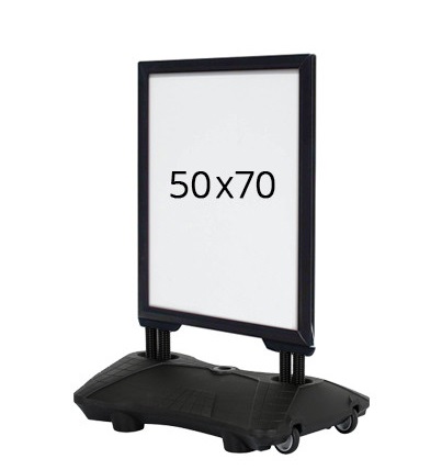 Stoepbord Boulevard Din B2 - afmeting. 50x70cm - Rollerbase. Kleur zwart. Profiel 32mm. Verrijdbaar stoepbord met wielen en op veren, voorzien van 4 klikprofielen en transparante voorzetfolie aan elk van de 2 zijden. De rugplaat is van metaal. Voet is te vullen met zand of water, waardoor deze het geheel zwaarder maakt. Folie afmeting in dit bord 52,5 x 72,5 cm.