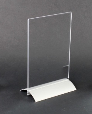 Menustandaard A5 vertikaal met acryl voet, met in de voetplaat een insteek voor de acryl kaarthouder A. Voor papiermaat 148x210mm.