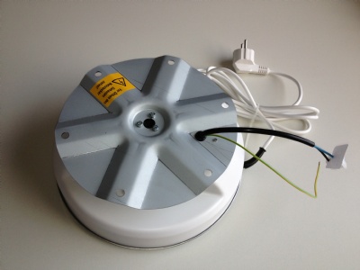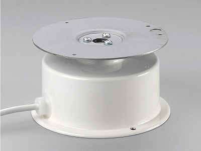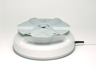 Draaiplateau met maximaal draagvermogen 20 kg (=maximale draagvermogen bij gelijkmatige belasting) aansluiting op 220V met sleepcontact voor aansluiting van bijvoorbeeld verlichting op het draaiplateau, diameter 230mm hoogte 100mm, draaisnelheid 2,5 omwentelingen per minuut.