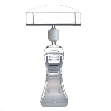 Pop-clip kaarthouder met voetje compleet transparant - hoogte tussen-staafje 50mm. Breedte klem 27mm. Klemdikte 1 mm. Draaibaar kogelgewricht.