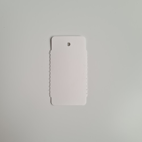 Hangetiket op rol 30x50 mm zwart bedrukt 1000 per rol, wel ponsgaatje, en wel horizontale perforatie in kaartje. Confectie-etiket, karton, Prijs/nr/maat, 30x50mm. Confectielabel, prijslabel. Prijskaartje, hanglabel, geschikt om met een textieltang en riddersporen/textielpins aan kleding te schieten. Tussen de hangkaartjes zit er altijd ook een perforatie. FSC®-C004451