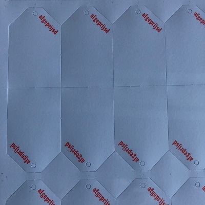 Hangetiket 38x60 mm afgeprijsd, pak met 1020 etiketten (34 vellenà 30 etiketten) Confectielabel, prijslabel. Prijskaartje, hanglabel, geschikt om met een textieltang en riddersporen/textielpins aan kleding te schieten. Zo lang de voorraad strekt.