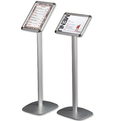 Info-standaard A4 metalen zwarte voetplaat en buis. Hoogte maximaal 86cm. Uitgevoerd met magnetische sluiting. Kaarthouder A4 kan horizontaal en vertikaal gemonteerd worden.