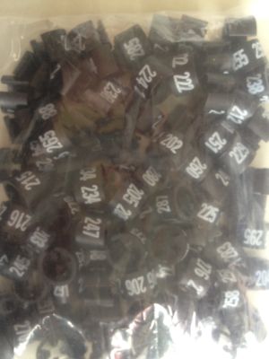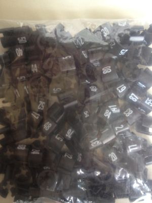 Collectie-serie MINI zwart nummer 201 tot en met 300. Inhoud zakje bestaat uit oplopende nummering. Diameter 13mm, hoogte 11mm, cijfer afmeting 6mm hoog. Geschikt voor kledinghangers met diameter van 2,5 tot 3,5mm.