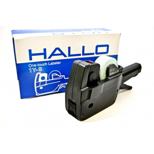 Prijstang Hallo 1Y-S ONE-TOUCH labeller afdruk €123.45 voor rechthoekige etiketten waarvan boven en onderzijde een halve maan is uitgestanst, afmeting etiket 21,6x12 + gat. Maximaal 6 digits. Etiketten moeten aan buitenzijde op de rol zitten, passende etiketten beginnen met art.nr. 27383....
