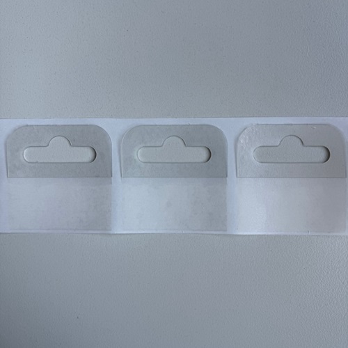 Hang-ups 50x50 mm, met kleeflaag 50x28 mm, met Euroslot voor boardhaken. Verpakt op rollen van 2000 stuks. Aantal: 2000 Formaat: 50 x 50 mm Kleefstrook: Flexi Lijm formaat: 50 x 28 mm Materiaal: 250 micron PET top