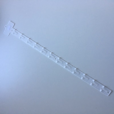 Hang-strip heavy duty met 12 clips, lengte 58cm, breedte 28mm. Hangstrip. Uitvoering met vast label, afmeting label 76x35mm Lengte: 58 cm zonder label. Lengte met label 62 cm. Aantal clips: 12 Afstand clips: 41 mm