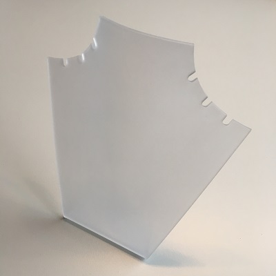 Collierpresentatie >groot< gebogen en gevormd acryl frost / melkglas, voorzien van hangsleufje, hoogte 20,5cm x breedte 18cm x diepte 7,5cm.