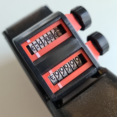 Prijstang BLITZ S14 . 2-Regelige prijstang met op de bovenste regel 8 posities voor een prijs/nummer/datum, en op de onderste regel een prijs €999,99 Passende etiketten beginnen met artikelnr. 27183... Met Euro-teken.