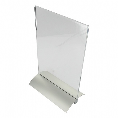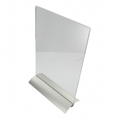 Presenter / tafelstandaard / Menu standaard acryl A4 - 21x30cm - 2-delige prijskaarthouder met aluminium metalen voet. Voet bestaat uit één aluminium plaat, voorzien van SuperGrip kunststof profiel met weerhaakjes. De weerhaakjes zorgen er voor dat de acrylaathouder stabiel blijft zitten.