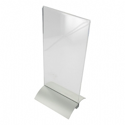Presenter / tafelstandaard / Menu standaard acryl 1/3A4 - 10x21cm - 2-delige prijskaarthouder met aluminium metalen voet. Voet bestaat uit één aluminium plaat, voorzien van SuperGrip kunststof profiel met weerhaakjes. De weerhaakjes zorgen er voor dat de acrylaathouder stabiel blijft zitten.