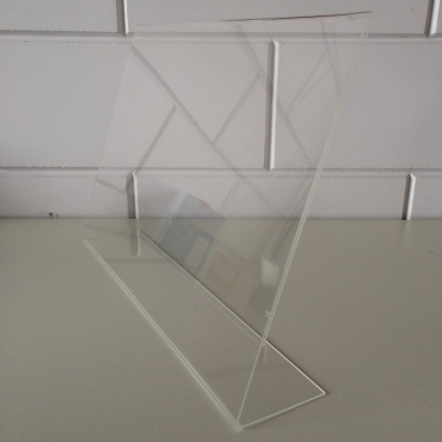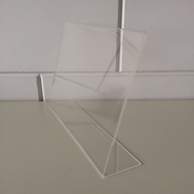 L-standaard Din A3 liggend acryl bxh 420x297mm, of Din A3, dit model is horizontaal, landscape. Er kan hier een prijskaart of papier tussen geschoven worden. L-display. Made in Holland. L-standaard - Afmeting kaarthouder: 420x297mm / Din A3 - Uitvoering: liggend formaat / landscape - Eénzijdig zichtbare kaarthouder - Hellend achterover - Kleur: transparant - Materiaal: acryl (PMMA) - Materiaaldikte: 2,0 mm - Stand oppervlak: 420x80mm - Beschermfolie: ja Een affichehouder is een stevige oplossing voor het presenteren van uw boodschap.