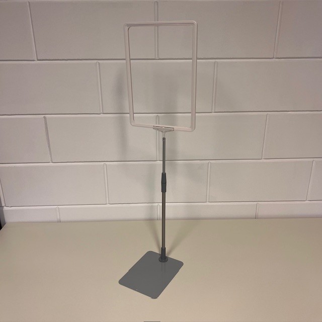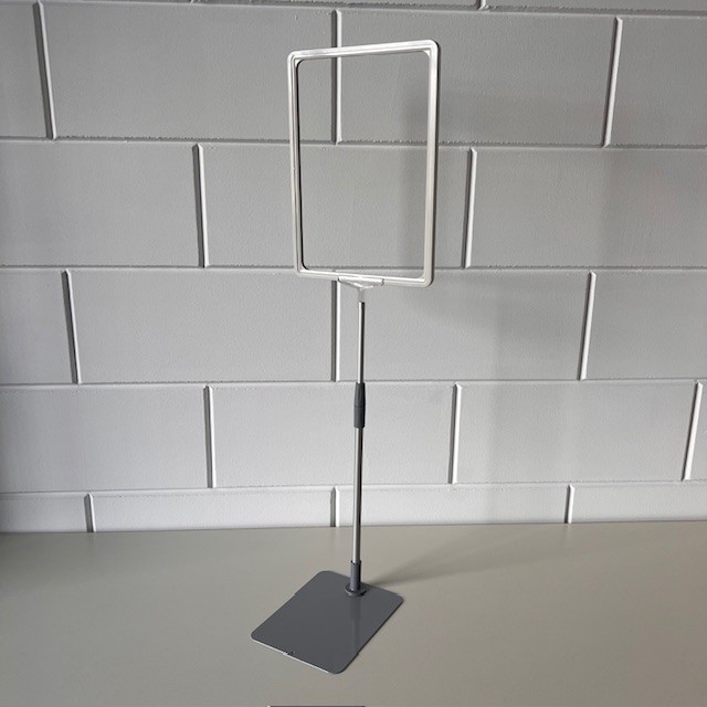 Prijskaartstandaard A4 wit raam met transparant T-stuk, verstelbare aluminium buis en metalen grijze voetplaat. Verstelbaar/ uitschuifbaar van 32 tot 58 cm. Dit is voor ons een samengesteld artikelnummer uit 4 andere artikelnummers. Bij >Gerelateerde artikelen< kunt u de huidige voorraad zien. Samengesteld uit artikelen: 120104.. 12017594 12017595 12017602 Verkoopprijs totaal € 11,77 excl.btw.