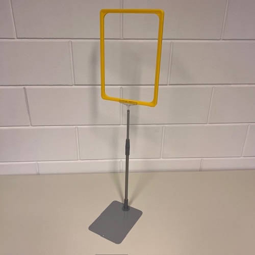 Standaard A4 geel raam met transparant T-stuk, verstelbare aluminium buis en metalen grijze voetplaat. Verstelbaar/ uitschuifbaar van 32 tot 58 cm. Dit is voor ons een samengesteld artikelnummer uit 4 andere artikelnummers. Bij >Gerelateerde artikelen< kunt u de huidige voorraad zien. Samengesteld uit artikelen: 120104.. 12017594 12017595 12017602 Verkoopprijs totaal € 11,77 excl.btw.