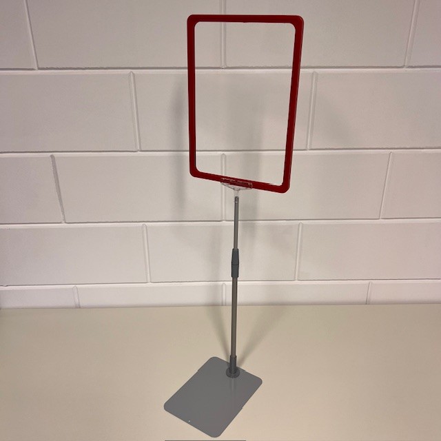 Standaard A4 rood raam met transparant T-stuk, verstelbare aluminium buis en metalen grijze voetplaat. Verstelbaar/ uitschuifbaar van 32 tot 58 cm. Dit is voor ons een samengesteld artikelnummer uit 4 andere artikelnummers. Bij >Gerelateerde artikelen< kunt u de huidige voorraad zien. Samengesteld uit artikelen: 120104.. 12017594 12017595 12017602 Verkoopprijs totaal € 11,77 excl.btw.