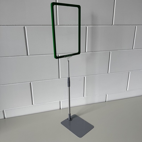 Standaard A4 groen raam met transparant T-stuk, verstelbare aluminium buis en metalen grijze voetplaat. Verstelbaar/ uitschuifbaar van 32 tot 58 cm. Dit is voor ons een samengesteld artikelnummer uit 4 andere artikelnummers. Bij >Gerelateerde artikelen< kunt u de huidige voorraad zien. Samengesteld uit artikelen: 120104.. 12017594 12017595 12017602 Verkoopprijs totaal € 11,77 excl.btw.