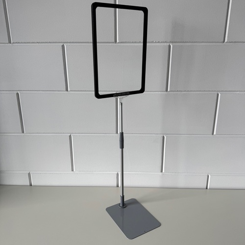Standaard A4 zwart raam met transparant T-stuk, verstelbare aluminium buis en metalen grijze voetplaat. Verstelbaar/ uitschuifbaar van 32 tot 58 cm. Dit is voor ons een samengesteld artikelnummer uit 4 andere artikelnummers. Bij >Gerelateerde artikelen< kunt u de huidige voorraad zien. Samengesteld uit artikelen: 120104.. 12017594 12017595 12017602 Verkoopprijs totaal € 11,77 excl.btw.
