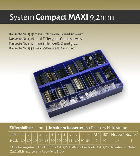 Prijscassette Compact Maxi 1315 zwart/wit, hoogte blokje 12mm cijferhoogte 9,2 mm. Bestaat uit 360 onderdelen.