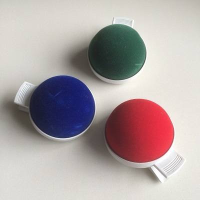 Speldenkussen met polsklem / armhouder. Diameter kussen ongeveer 6cm. Wijdte armhouder 5 tot 7 cm. Willekeurige kleur.