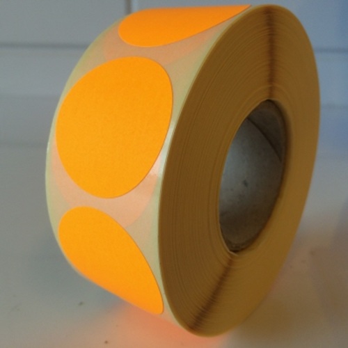 Etiket 35 mm rond fluor oranje kleefkracht permanent, aantal etiketten 1000 stuks op rol. FSC-C106281 De kern heeft een diameter van 40 mm, etiketten zitten aan de buitenzijde gewikkeld. - Afmeting: 35mm - Vorm: rond - Kleur: fluor oranje - Materiaal: zelfklevend papier - Kleefkracht: permanent (sterk klevend) - Randafwerking: rond etiket - Aantal per rol: 1.000 etiketten - Prijs per: 1 rol Wat zijn de voordelen? Deze etiketten zijn ideaal voor het labelen van producten of verpakkingen, als sluitzegel waar het etiket gedurende lange tijd moet blijven zitten zonder los te komen.