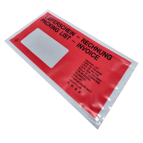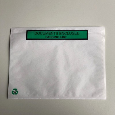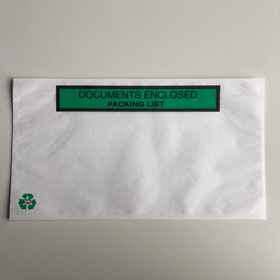 Paklijstenveloppen C5 > Documents enclosed<. Inhoud 225x160mm Geschikt voor A5, buitenmaat 235x175mm. (Afmeting C5) Doosinhoud 1000 stuks, doculops, zelfklevende paklijst-enveloppen. Toplaag transparant PP 45 micron, onderlaag transparant PP 30 micron, lijmlaag 25 grams hot melt. Dikte totaal dus 0,75 micron.