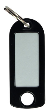 Sleutelhangers 100 stuks gesorteerd, met ring-haken in displaydoos. (100 stuks gesorteerde kleuren) Afmeting 22x55mm, met verwijderbaar etiket en plastic venstertje afmeting 32 x 14 mm