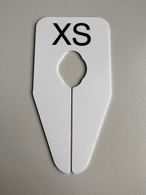 Maataanduider ovaal wit met zwarte bedrukking XS , afmeting breedte 75mm x hoogte 150mm. Geschikt voor ovale buis met afmeting: 30x15mm, 35x16mm, 35x20mm en ronde buis tot 28mm.