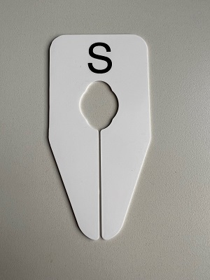 Maataanduider ovaal wit met zwarte bedrukking S , afmeting breedte 75mm x hoogte 150mm. Geschikt voor ovale buis met afmeting: 30x15mm, 35x16mm, 35x20mm en ronde buis tot 28mm.