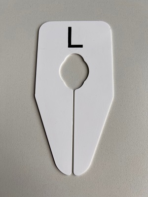 Maataanduider ovaal wit met zwarte bedrukking L , afmeting breedte 75mm x hoogte 150mm. Geschikt voor ovale buis met afmeting: 30x15mm, 35x16mm, 35x20mm en ronde buis tot 28mm.