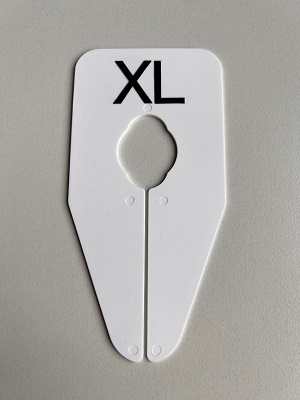Maataanduider ovaal wit met zwarte bedrukking XXXXL , afmeting breedte 75mm x hoogte 150mm. Geschikt voor ovale buis met afmeting: 30x15mm, 35x16mm, 35x20mm en ronde buis tot 28mm.