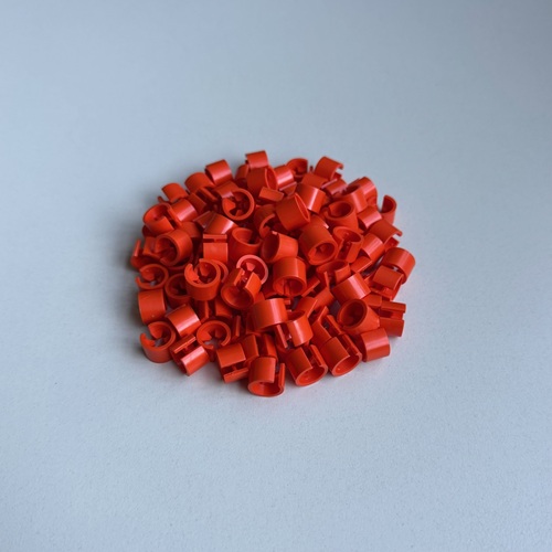 Minimarker onbedrukt normaal rood, verpakt in zakjes met 100 stuks. Diameter 13mm, hoogte 10mm. Geschikt voor kledinghangers met diameter van 2,5 tot 3,5mm.