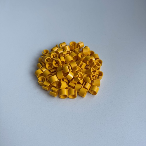 Minimarker onbedrukt geel, verpakt in zakjes met 100 stuks. Diameter 13mm, hoogte 10mm. Geschikt voor kledinghangers met diameter van 2,5 tot 3,5mm.